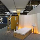 ベッドの隣には、携帯可能でマッサージなどにも使用できる、マットレスと同素材の《エアウィーブ ポータブル ミニ》(エアウィーヴ)も併せて展示します〈High-gieneとHigh-tech〉。