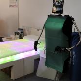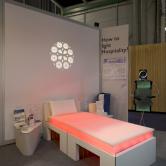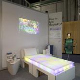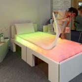 Un jeu de variations de lumière colorée à travers le matelas et une projection en tête de lit