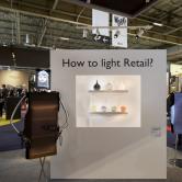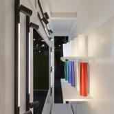 Le corner RETAIL est un ingénieux système de double mur. Ses étagères intégrées permettent de visualiser comment éclairer, par exemple dans une vitrine, dans une boutique. Des systèmes de rails d’éclairage comprenant différents luminaires sont installés derrière le premier mur. On peut voir