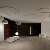Levez la tête, au plafond se trouve une nouvelle tendance en matière de conception d’éclairage. Des rails incurvés et leurs luminaires (spots, suspensions etc.) permettent de réaliser librement un « dessin » (by Flos). Ici, la combinaison de différents luminaires décoratifs crée un accent original.