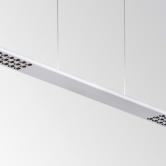 Au-dessus du bureau, une suspension très fine, dernière née de sa collection, fournit une lumière directe fonctionnelle sur la table et un éclairage indirect vers le haut pour l'ambiance générale (by Flos). On peut moduler l'intensité et la nuance de blanc afin de réguler l'horloge biologique du corps humain et donc améliorer les performances de travail ainsi que la qualité du sommeil. Cette technologie appelée « human centric lighting » est actuellement un point de mire dans le domaine de l'éclairage.